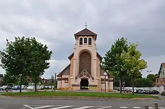 Avec son clocher-porche qui ressemble à un campanile roman italien court et trapu, ses vitraux Art déco, ses riches mosaïques, sa ferronnerie (notamment ses lustres), etc., l'église sans transept avec abside semi-circulaire représente un exemple remarquable du renouveau stylistique des années 1920 dans le Nord de la France[6]. L'intérieur de briques montre une charpente de bois apparente; les bas-côtés sont séparés de la nef par de puissantes colonnes au chapiteau néo-roman. Les stations du chemin de croix sont en mosaïques. Les trois baies en vitraux du chœur sont dans les tonalités de bleu. La façade est éclairée par une grande baie en hauteur de vitraux colorés dessinant une croix glorieuse et prenant tout l'espace entre le campanile et le porche. Celui-ci montre sur son linteau une croix pattée en mosaïque. Le même motif de mosaïques se retrouve en frise sur la façade. Le chevet est décoré de briques vernissées, ainsi que le dessous des toits en façade.