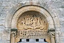 La partie droite du linteau est occupé par la Cène, dernier repas de Jésus entouré du collège apostolique ici au complet. Mais c'est une iconographie double puisque la Cène a été ajouté un éléments emprunté au repas chez Simon relaté en l'évangile selon Luc, 7, 36-50) où Marie-Madeleine, patronne de l'église, s'agenouillant pour laver les pieds du Christ, les essuyant avec ses cheveux[5].