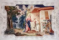 La fresque nord illustre la Visitation de la Vierge Marie. Marie, coiffée d’un chapeau, figure au centre. Elle est représentée en position surélevée, à l’entrée d’un bâtiment à colonnes, vêtue d’une robe rose et d’un manteau bleu. Sa main droite se tient à la barrière, tandis que la gauche s’étend en direction de l’épaule d’Elisabeth. Cette dernière femme âgée à longs cheveux gris, porte un habit vert et manteau rose. Son bras droit s’étend vers l’avant, et elle touche du doigt le ventre déjà arrondi de Marie. Entre les deux femmes, un petit chien jappe en direction de la Vierge. Derrière celle-ci se tient l’époux d’Elisabeth, Zacharie, vieil homme à barbe blanche, en conversation avec Joseph de Nazareth, l’époux de Marie. Le haut de l’image est occupé par une architecture baroque, avec colonnes et pampres de vignes.