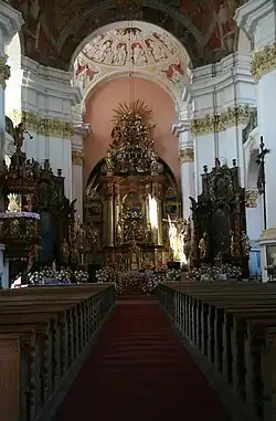 Une première église a été construite en bois et a brûlée au XVe siècle lors d'un des incendies qui ont ravagé la ville. À sa place, un temple gothique a été érigé, qui a également été détruit dans un incendie en 1688, mais les éléments qui ont survécu à l'incendie sont devenus une partie de l'église actuelle érigée en 1727-1730 par l'architecte Jan Jakub Scheerhofer (Johann Jacob Scheerhofer) dans un style baroque.