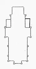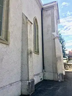 L'église est renforcée par quatorze contreforts et ornée de neuf vitraux[28]. La sacristie, adossée au mur ouest, est accessible par l'une des deux portes situées à l'arrière du chœur.