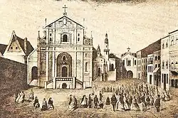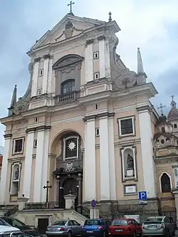 Les Carmes déchaux venus de Lublin avaient fait construire une petite église de bois pour leur couvent en 1627. quelques années plus tard, ils en font construire une plus grande en pierre grâce aux dons du vice-chancelier du grand-duché de Lituanie (rattaché à la Pologne par l'Union de Lublin), Michel-Christophe Pac[1]. Consacrée au milieu du XVIIe siècle à la grande mystique carmélite sainte Thérèse d'Avila, l'église est de type basilical, avec une façade ressemblant aux églises jésuites de l'époque. Elle est probablement construite par l'architecte Ulrich Gosius qui fut l'auteur du palais Radziwill de la ville. La façade, quant à elle, fut certainement dessinée par l'architecte italien Constantino Tencalo qui dessina la chapelle Saint-Casimir abritant les reliques de saint Casimir de Pologne dans la cathédrale de Vilnius.