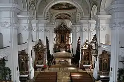 Les stalles du chœur d'Andreas Etschmann (de) proviennent de l'ancienne église du début du baroque. Il montre les différents fondateurs de l'ordre au dernier rang. La sacristie, qui a été conservée lors de la démolition de l'église baroque précédente, présente de lourds stucs baroques sur le plafond en berceau et d'excellentes sculptures d'Andreas Etschmann sur les armoires de la sacristie.