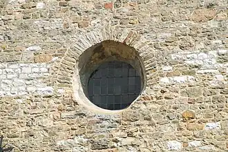 La façade occidentale, impressionnante de sobriété, présente pour toute décoration un petit oculus orné, dans sa moitié supérieure, d'un arc constitué de moellons.