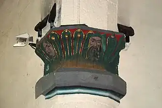 Les colonnes situées de part et d'autre du chœur portent de beaux chapiteaux ornés de feuilles stylisées de couleur vert et or sur fond rouge.