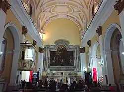 À l'intérieur à droite, on remarque une balle, enlevée de la façade extérieure après un bombardement de la Seconde Guerre mondiale. Sur la gauche une plaque est posée à terre au milieu de l'atrium. Le maître-autel polychrome est particulièrement remarquable. Des sculptures d'anges et des tableaux ont été enlevés par le ministère des biens et activités culturels et placés dans des musées et autres lieux. Sur les côtés, on remarque les deux ronds de marbre représentant La Vierge à l'Enfant du XVIe siècle[2].