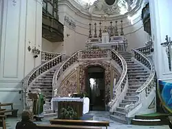 L'église s'inscrit dans un plan circulaire avec une nef et des chapelles latérales. La caractéristique la plus spectaculaire de l'intérieur, c'est l'abside avec son maître-autel auquel on accède par un majestueux escalier à double rampe.