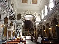 Les décorations de stuc remontent au XVIIe siècle. L'intérieur est remanié au XVIIIe siècle avec notamment un nouveau maître-autel de Vaccaro de 1729. On remarque au fond de l'abside un orgue majestueux. La sacristie de goût rococo date de 1739, œuvre de Michelangelo Porzio. Le campanile et la sacristie forment un décor scénographique qui marque le fond de la petite place Rosario di Palazzo, où donne l'entrée secondaire de l'église. La coupole, un temps colorée de majoliques, domine les constructions environnantes. Le portail remonte au XVIe siècle; on y distingue le nom gravé et les armoiries de la famille du fondateur.
