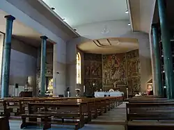 L'intérieur a trois nefs est séparé par des colonnes de marbre vert et l'abside abrite une mosaïque représentant un Christ bénissant avec les saints Fabien et Venance.