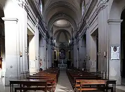 L'intérieur présente des stalles en bois du XVIIIe siècle. Les panneaux en terre cuite de la Via Crucis ont été réalisées en 1965 par Luigi Minciotti. Le premier autel à droite possède une fresque dédiée à la Madonna della Luce et une du XVe siècle représentant les saints Bernardin de Sienne et Catherine. Le retable est une toile représentant l'Immaculée Conception avec les saints Jean l'Évangéliste et Nicolas de Bari (XVIIe siècle) attribuée à Angelo Pucciatti. Dans une salle de l'ancienne sacristie se trouve une Assomption avec les saints Charles Borromée, Antoine Abbé, Marie Madeleine et François (1640) de Filippo Caparozzi et dans la nef droite du presbytère un retable représentant la Vierge au sépulcre avec l'Ange de la Passion (XVIIIe siècle) de Ludovico Mazzanti. Dans la chapelle Prada se trouve un Massacre des Innocents (1764) de Vincenzo Strigelli auteur également du retable principal représentant le Martyre des saints Faustino et Giovita en prison (1761). Dans l'abside gauche se trouve l'icône de la Vierge de Constantinople. D'autres retables (XVIIIe siècle) représentent Saint Jean de Patmos d'Urbano Romanelli (fils de Giovanni Francesco) et une Décollation de Jean-Baptiste d'Anton Angelo Bonifazi, transférée depuis l'église de San Giovanni Decollato[2].