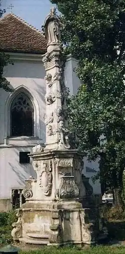 Devant l'église, on retrouve l'ancien portail baroque de l'Église Sfântu-Mihail et, derrière, est érigée la Statue de la Vierge qui se trouvait initialement devant l'Église des Piaristes. La statue a été placée derrière l'église au temps du régime communiste, officiellement athée. En 2008, on discutait sur la possibilité de la remettre à son emplacement originel.