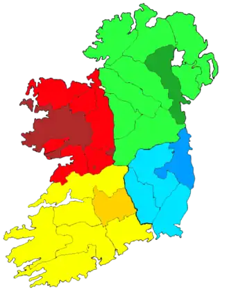 Les diocèses irlandais dans leurs quatre provinces ecclésiastiques : Armagh en vert, Cashel et Emly en jaune, Dublin en bleu et Tuam en rouge. Les sièges métropolitains sont plus sombres que leurs suffragants.