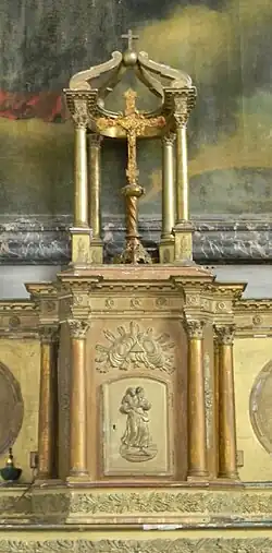 L’autel est dit de style tombeau. Les différents marbres utilisés viennent des carrières de Mayenne. Les colonnes sont ioniques et corinthiennes. (Baroque) Les dessins en relief de végétaux sont typiques du XVIIIe siècle. On trouve les deux thèmes du blé et de la vigne. Noter le magnifique présentoir central. Les deux autels qui flanquent l'arc central sont de la même période.