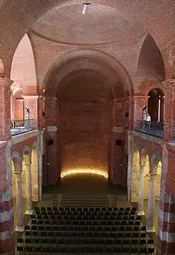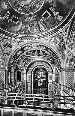 Contrairement à ce que suggère la vue extérieure, l'intérieur du bâtiment est voûté de dômes - basé sur l'architecture byzantine. Les colonnes sur les côtés portent des galeries. En renonçant aux mesures de conservation après la destruction de la Seconde Guerre mondiale, la peinture colorée originale des voûtes de style nazaréen, ainsi que le revêtement en marbre des murs et du sol en marbre, ont été perdus, à l'exception de petits vestiges. Les peintures provenaient de Heinrich Maria von Hess et de son élève Joseph Schwarzmann, qui, en tant qu'ornementateur, créa le premier de ses célèbres décors ultérieurs. Aujourd'hui les murs et les voûtes ne sont pas enduits, les surfaces en briques ne sont pas traitées. Pour des raisons de solidité, les piliers ont été construits avec des couches de tuf, qui est maintenant visible sous la forme d'un motif rayé. Les endroits où les dommages causés par les briques insérées ont dû être compensés sont clairement reconnaissables comme nouveaux par les surfaces plus lisses. Cela s'applique également aux autres nouveaux luminaires en acier, en verre et en béton.