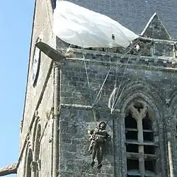 Son clocher est connu pour être celui auquel est resté accroché le parachute de John Steele, lors de l'opération Albany au début de la bataille de Normandie. Son histoire devient célèbre en 1962 à la suite de la sortie du film Le Jour le plus long si bien que les touristes de passage à Sainte-Mère-Église demandaient aux autochtones s'ils étaient bien sur la place de l'église du parachutiste. Le comité des fêtes de la commune décida alors d'accrocher au clocher un mannequin nommé « Big Jim » en souvenir de John Steele. Le parachute, l'uniforme et l'équipement du mannequin sont changés deux fois par an en raison du climat pluvieux du Cotentin. La commune a ouvert une ligne budgétaire pour le couvrir d'une peinture protectrice pour le changer moins souvent[3].