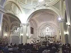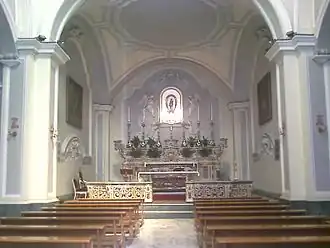 L'intérieur est richement décoré de stucs ; il comprend une nef et des petites chapelles latérales et se termine par une abside rectangulaire. L'église est couverte de voûtes en berceau et d'une coupole elliptique.