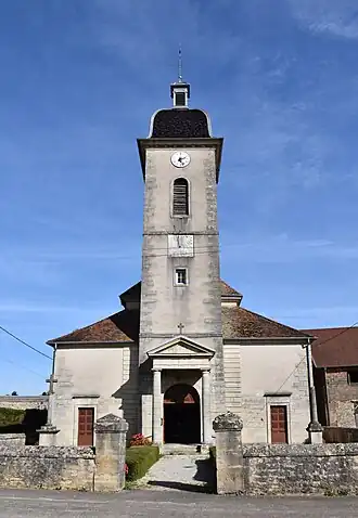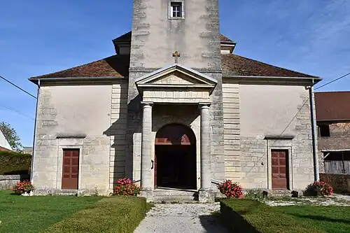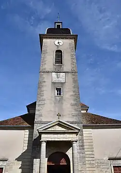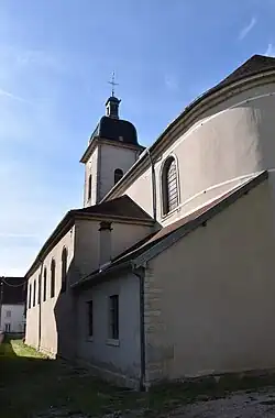 Cette église est à clocher comtois couvert de tuiles vernissées, surmonté d’un petit lanternon.
