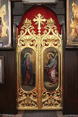 De plan rectangulaire, l'église est constituée d'une nef unique prolongée par une abside demi-circulaire et précédée d'un narthex[4] construit en 1899, séparé de la nef par un haut passage voûté[3]. À l'intérieur, la voûte en berceau est soutenue par des arcs formeret reposant des pilastres[4]. L'iconostase a été préservée des destructions de 1943 ; elle abrite des icônes de la seconde moitié du XIXe siècle, peintes en 1863 par un artiste inconnu ; seuls les noms des contributeurs sont indiqués[4]. Les portes royales ont été peintes en 1869 par un autre artiste, lui aussi inconnu[3].