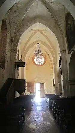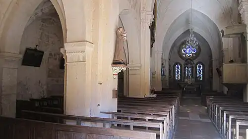 La nef asymétrique longue de 28 mètres, haute de 10 mètres en 4 travées, ne présente qu'un seul bas-côté à gauche. Les piliers quadrangulaires aux chapiteaux très simples soutiennent les voûtes en ogives. L'édifice est soutenu par 14 contreforts. Le sanctuaire à chevet plat est éclairé par 3 baies en lancettes surmontées d'une rose à 4 festons richement colorés.