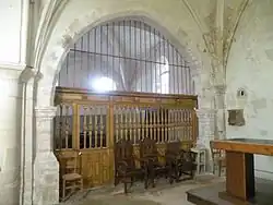 - La clôture en bois de la chapelle porte les caractéristiques de la Renaissance, et devrait dater de la période comprise entre 1560 et 1610 environ. Les longs et minces balustres portent d'étroites arcatures en plein cintre, dont les intervalles sont percés d'orifices ovales. Les montants de la porte sont revêtus de petits panneaux méplats. La clôture est sommée d'un entablement aniconique, dont la corniche repose sur des consoles revêtues de feuillages assez espacées, placées devant la métope[15],[12].