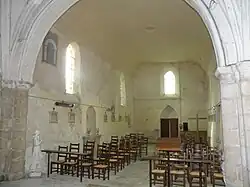 - Devant le chœur, une dalle funéraire est scellée dans le sol. Les quelques caractères en capitale romaine évoquent le XVIIe ou le XVIIIe siècle, mais l'épitaphe est devenue indéchiffrable sous l'effet de l'usure[14].