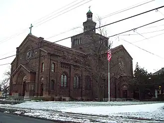 L'église de briques est construite en 1923-1928 en pur style lombard néoroman du XIIe siècle et elle est considérée aux États-Unis, comme étant la réplique la plus fidèle de ce style. L'école date de 1906-1907 et la maison paroissiale de 1914. L'église est dominée au milieu du transept par une coupole octogonale surmontée d'une lanterne.