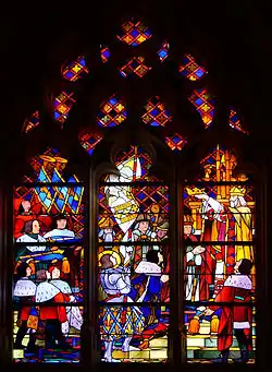 - Statues en bois de Marie et d'un ange qui avaient été mises à l'abri au Palais du Tau de Reims lors de la Première Guerre mondiale et qui subirent le même sort que lui : les bombes allemandes y mirent le feu.