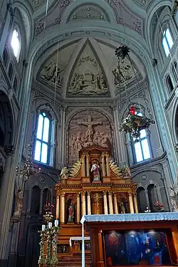 La voûte du Gesù, formée de cinq arcades, est ornée de fresques grandioses, copies de chefs-d'œuvre des grands maîtres de l'école allemande, œuvres du peintre Daniel Muller, en 1865-1866, qui, pour des raisons qu'on ignore, a utilisé de la peinture à l'eau de telle sorte qu'on ne put jamais les laver. Dans cette église, on retrouve la statue de Notre-Dame-de-Liesse, rapportée de France en 1877, qui contient les cendres de la statue originale brûlée au cours de la Révolution française. Une des nefs de l'église abrite un reliquaire dédié aux Martyrs canadiens comportant des reliques (ossements) des missionnaires jésuites Jean de Brébeuf, Gabriel Lalemant et Charles Garnier.