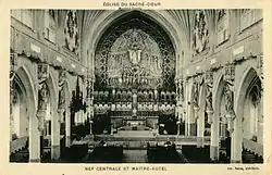 Toute l'architecture converge vers le chœur occupé par un maître-autel en marbre blanc orné de trois bas-reliefs encadrés des statues des évangélistes. L'arrière est occupée par un retable de stuc. Dans la partie inférieure, une série de bas-reliefs représentent des scènes bibliques. Douze mosaïques de verre multicolore et de moulages présentent un groupe de saints et saintes. Enfin, un haut-relief représentant l'apothéose du Sacré-Cœur de Jésus entouré d'anges qui portent sa couronne céleste domine le tout. Le moulage est réalisé par la maison Carli et Petrucci de Montréal
