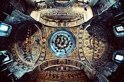 C’est un exemple du style brâncovan : décor en médaillons représentant des saints, arabesques florales peintes sur les murs et dentelle de pierre autour des Verrières.