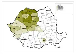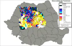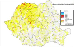 Le poids relatif des grecs-catholiques roumains par rapport aux orthodoxes en 1930 : en jaune grecs-catholiques plus nombreux que les orthodoxes ; en vert orthodoxes plus nombreux que les grecs-catholiques (vert et jaune à l'exception des alentours de Bucarest au sud du pays : anciens territoires de l'empire austro-hongrois) ; en violet moins de 5 % de grecs-catholiques (anciennes principautés danubiennes).