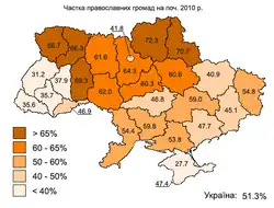 L'Ukraine est l'un des pays les plus religieux d'Europe, avec jusqu'à 76 % de la population croyant en Dieu et 37 % fréquentant régulièrement l'Église. L'Église a une influence importante et peut servir de soft power. Selon un sondage, 63,5 % des Ukrainiens lui font confiance, un taux plus élevé que pour les autorités publiques[66],[67]. En 2014, cependant, il n'y avait plus d'Église orthodoxe indépendante en Ukraine. À cette époque il existait trois branches différentes de l'Église orthodoxe[68]. La plus grande église était l'Église orthodoxe ukrainienne (patriarcat de Moscou), réunissant 12 000 paroisses. Cette dernière était directement subordonnée à l'Église orthodoxe russe et à Moscou[69]. La deuxième était l'Église orthodoxe ukrainienne (patriarcat de Kiev) indépendante, mais l' Église orthodoxe hors de la communauté de l'orthodoxie œcuménique et non canonique (ru) a vu le jour en 1992 au sein des communautés orthodoxes, mécontentes de leur faible autonomie vis-à-vis de l'Église orthodoxe russe. L'Église orthodoxe autocéphale (1990—2018) est une église indépendante et non canonique, apparue après dissolution de l'Empire russe (en) dans la diaspora ukrainienne des États-Unis et du Canada[69],[70],[71],[72].