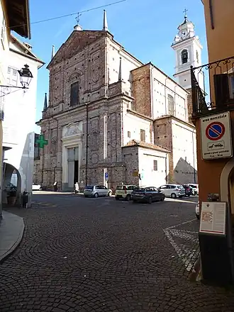 Au XIIIesiècle, l’église de Santa Maria est édifiée sur le site de l’actuelle église paroissiale. Cet édifice médiéval de Sainte Marie portait alors le surnom de «Sainte Marie de la vache» (Santa Maria della Vacca), du fait que la communauté du village offrait chaque année une vache au prêtre. Lors de la seconde moitié du XVIIesiècle, l’église sera profondément remaniée, sous la direction de l’architecte de la cour savoyarde Giovenale Boetto (1604-1678). Mais elle subira peu après, entre la fin du XVIIe et le début du XVIIIesiècle, de nombreux dommages en raison des fréquentes guerres survenues en cette période, en particulier les Guerres du Sel (Guerre del Sale) (1680-1699). Les dommages seront tels qu'il deviendra nécessaire de reconstruire une nouvelle église, qui verra le jour sous les plans du jeune architecte Francesco Gallo (1672-1750), à partir de 1703, jusqu'en 1719[1],[2],[3].
