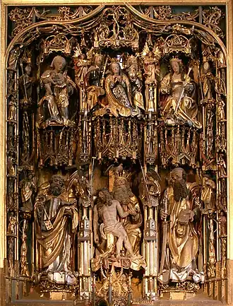 La partie inférieure du retable représente le Trône de Grâce sous la forme de la pietà qui met en scène Dieu et son fils Jésus mort sur ses genoux, flanqués de Pierre et Paul. De chaque côté des saints se trouvent des figurines plus petites : les martyrs Laurent de Rome et saint Étienne. La scène centrale est surplombée par la colombe du Saint-Esprit et est entourée d'anges portant des outils de souffrance comme la croix et la lance. Ces anges ne sont pas souvent représentées aux côtés du Trône de Grâce, mais ils sont toutefois liés au thème du Jugement qui est marqué dans ce retable[8].