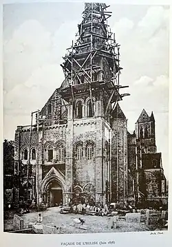 Le caractère roman du massif occidental n'a jamais fait de doute. C'est par sa construction que le projet de reconstruction de la fin du XIe siècle est relancé, ou plutôt rendu caduque, vers 1130 / 1140 selon Delphine Hanquiez à la lumière de ses recherches approfondies[27]. Selon l'hypothèse émise par Eugène Lefèvre-Pontalis[18], la nouvelle façade et l'avant-nef avec la tour méridionale servent à l'ancienne nef dans un premier temps, mais les fouilles en 1955 ont révélé que celle-ci ne commence que trois travées plus loin à l'est[28], soit 13 m environ[29]. Par ailleurs, l'on suppose aujourd'hui que la tour manquante au nord de la façade (à gauche) n'a jamais existé. — Une fois le massif occidental achevé dans cet état incomplet, le projet est reconsidéré. C'est du côté opposé que le chantier reprend, peut-être dès les années 1140, avec les travaux de terrassement et la construction du soubassement de la nouvelle abside avec ses chapelles rayonnantes. En effet, des marques de tâcheron similaires permettent la conclusion que des artisans déjà engagés pour l'érection du massif occidental restent à l'œuvre sur le chantier du sanctuaire. La progression se fait par tranches horizontales. Une fois les voûtes des chapelles rayonnantes terminées (années 1160), l'on s'attaque aux piliers du rond-point de l'abside, aux voûtes du déambulatoire (années 1170), puis aux deux premiers niveaux des travées droites du chœur (années 1170-1180). Les concernant, les grandes arcades et les murs gouttereaux des bas-côtés sont entrepris simultanément. Ce n'est qu'à partir de leur achèvement que débute le montage de l'étage des fenêtres hautes, toujours en commençant par le chevet. Au moment de la construction de ce troisième niveau d'élévation à l'ouest du chœur, à la fin du XIIe siècle, les piliers à la fin de la nef sont déjà debout. Le mur gouttereau du bas-côté nord est bâti à trois mètres de hauteur jusqu'au massif occidental, tandis que le mur gouttereau du bas-côté sud n'est bâti que sur un mètre et demi de hauteur, et s'arrête à la quatrième travée[30].