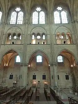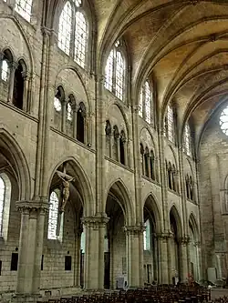 Pour cette phase du chantier, se pose la question de la destinée de l'église primitive, et des conditions de la continuité du culte, car les grandes arcades du nord de l'église gothique réutilisent les fondations du mur gouttereau nord de son prédécesseur. Cette question est d'autant plus inéluctable que le chantier s'interrompt pendant quelques années, entre le lancement de la construction des bas-côtés dans les années 1180 et le départ de travaux de la nef proprement dite vers 1190. Elle a toutefois été éludée par la recherche. Delphine Hanquiez pense cependant pouvoir affirmer que le déambulatoire était accessible aux fidèles, où ils pouvaient vénérer des reliques déposées dans les autels des chapelles rayonnantes[31]. Quoi qu'il en soit, la nef est édifiée entre 1190 et 1200 environ, en commençant au « nord » où la précédente campagne s'était arrêtée, et en avançant toujours par strates horizontales. Avec la minceur extrême de sa structure[32] opposée à l'ampleur du vaisseau central, l'église est une œuvre audacieuse, et l'ajourement du triforium par l'arrière et la quasi-généralisation de la pile composée sont des innovations. Après l'achèvement de l'église seulement, les bâtiments conventuels sont construits jusqu'en 1270 environ, dont le cloître vers 1220/1230. Les bâtiments sont alors occupés par vingt-cinq moines[33],[34], assistés d'une centaine de moines convers[réf. souhaitée].