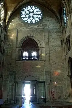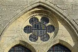 Vers 1270, une première modification intervient avec l'agrandissement des fenêtres des chapelles rayonnantes, qui sont dotées d'un réseau de style gothique rayonnant. Lors de la guerre de Cent Ans, le prieuré échappe à l'incendie lors de la prise de la ville par les Anglais et les Navarres en 1359 grâce au paiement d'une rançon. Vers la fin du XIIIe siècle, la chapelle des fonts baptismaux est ajoutée devant la troisième travée au sud[35],[36],[37]. Au XIVe siècle, l'église est restaurée pour la première fois[38]. Le régime de la commende fait son apparition précocement, au plus tard en 1401. Un pillage en 1436, dans la seconde phase de la guerre de Cent Ans dans la région, entraîne un incendie dans l'avant-nef et dans la première travée de la nef, détruisant également la toiture du chœur. L'église est réparée et la première pile libre côté nord est reprise en sous-œuvre sur un plan losangé, mais les conséquences de l'incendie se font encore ressentir au XIXe siècle et feront l'objet des premières restaurations après le classement de l'édifice[38].