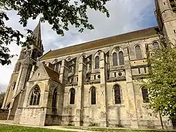 En tant que partie basse de l'abside, le déambulatoire est la première partie construite de l'église gothique, à partir des années 1150, si l'on considère que le massif occidental constitue la première étape d'un projet plus modeste, abandonné avant 1150. Pour cette raison, il est pertinent de débuter l'étude de l'édifice par le chevet. Les grandes arcades du rond-point du déambulatoire seront écartées dans un premier temps et évoquées dans le chapitre dédié à l'abside. À l'instar de celle-ci, le déambulatoire comporte une travée droite au nord et au sud : il n'y a donc que cinq travées « tournantes », de plan trapézoïdal. Elles seules s'accompagnent de chapelles ; encore, la première travée « tournante » au nord ne comporte-elle qu'une demi-chapelle de très faible profondeur, qui ne possède pas de voûte propre, et donc pas non plus d'arc-doubleau à son entrée. Cette travée particulière est munie d'une voûte à cinq branches d'ogives. Les quatre chapelles proprement dites sont également recouvertes de voûtes à cinq branches d'ogives, mais puisque ces chapelles sont peu profondes, les voûtains sont très resserrés. La faible profondeur des chapelles suffit pour qu'elles remplissent leur fonction, à savoir l'exposition de reliques et la célébration de messes particulières, dont les messes de fondation. Elle est notamment favorable à l'éclairage du premier niveau d'élévation, tout en sachant que la travée droite du nord est aveugle, et que la travée qui lui suit à l'est ne possède qu'une baie unique. Sinon, les chapelles reçoivent le jour par deux fenêtres. Les travées avec fenêtres ont la double largeur des travées sans fenêtres, où les chapelles contigües se touchent. Dans les chapelles du nord, nord-est et sud, les baies ont été agrandies vers 1270 environ et pourvues de remplages de style gothique rayonnant, avec deux ou trois lancettes à têtes trilobées surmontées d'un trèfle inscrit dans un cercle, et des écoinçons ajourés. L'on note la minceur des meneaux, qui se caractérisent par une modénature chanfreinée, mais sont agrémentés de fines colonnettes ou tores, portant des chapiteaux au niveau des impostes. Les lancettes simples de la chapelle d'axe et de la chapelle sud-est ont été refaites au XIXe siècle, dans le but de restituer leur disposition d'origine. Il n'est pas clair de quelle chapelle Maryse Bideault et Claudine Lautier parlent quand elles disent qu'elle conserve ses baies d'origine[71], car la photo prise par Jean-Eugène Durand[75] montre bien la couleur plus claire de l'encadrement des lancettes des chapelles d'axe et sud-est.