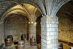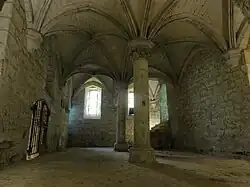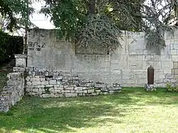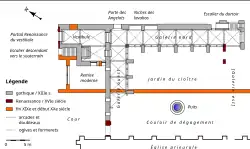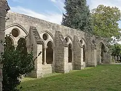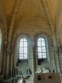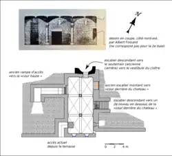 - ↑ Albert Fossard fait certainement erreur on y voyant les vestiges d'une simple galerie de circulation. Il mentionne implicitement ces baies : « D'une salle qui, primitivement n'était pas en sous-sol, appelée de nos jours salle capitulaire, on allait à l'église par une galerie encore apparente, quoique effondrée, et montant par des paliers que suivent les décrochements des fenêtres ; les chambranles de celles-ci se voient parfaitement à l'extérieur, dans la partie du mur vers la rivière » (1934, op. cit., p. 75).