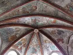 Dans le chœur de l'église simultanée, dédiée à Notre-Dame, on peut admirer des fresques peintes au XVe siècle, illustrant les mystères du christianisme, tel que le couronnement de la Vierge, le Jugement dernier. D'autre part, des dalles funéraires sont apposées contre les murs du sanctuaire.