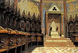 La cathèdre aux décorations cosmatesques a été construite au XIIIe siècle en assemblant divers éléments[10]. Le maître-autel, consacré en 1253 par Innocent IV, présente des panneaux en marbre et des décorations cosmatesques[8] : détruit par l'effondrement des voûtes le surplombant lors du tremblement de terre du , il a été fidèlement reconstruit à l'identique.