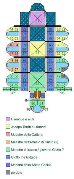 Selon les études les plus récentes, le cycle d'Assise semble être divisé en trois groupes distincts : le premier et le dernier avec sept tableaux chacun, le médian avec sept paires, soit quatorze tableaux en tout.