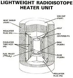 Les spécifications typiques[1] retenues par la NASA correspondent à des cylindres blindés dans une coque en alliage platine-rhodium pesant environ 40 g enveloppe comprise, pour une hauteur de 3,2 cm et un diamètre de 2,6 cm. Chaque élément contient une pastille de 2,7 g de 238PuO2.