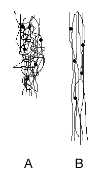 Pour limiter le glissement des chaînes du polymère liquide les unes par rapport aux autres, une légère réticulation crée des nœuds d'ancrage tout en conférant au matériau une structure tridimensionnelle. De la même manière que précédemment, les segments de chaînes entre deux nœuds sont normalement repliés (schéma A ci-contre). Si une traction est exercée sur la structure, les segments se déploient et la distance entre deux nœuds croît considérablement (schéma B) ; le matériau est très déformable.