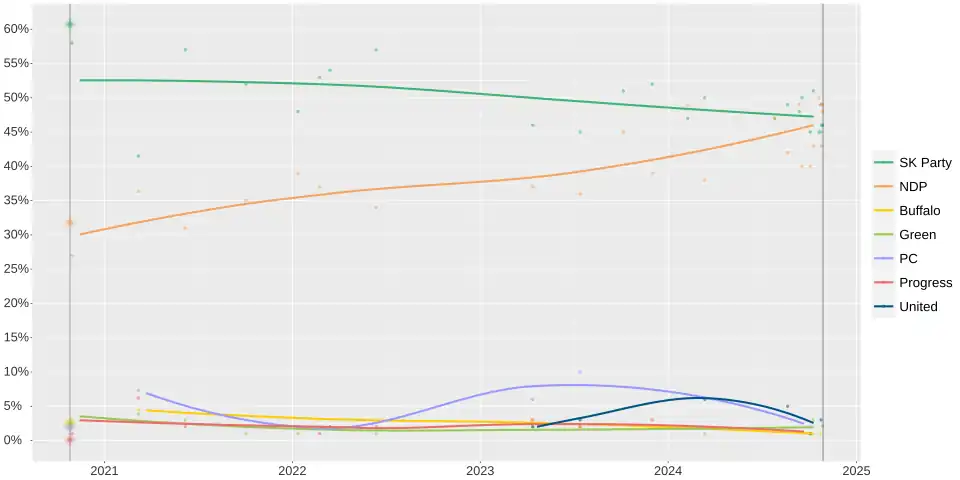| Date | Institut de sondages | Parti saskatchewanais | NPD | Parti Buffalo | Parti vert | Parti progressiste-conservateur | Parti du progrès | Parti uni | Autres |