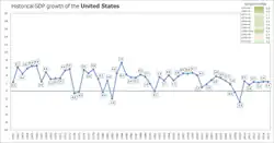 Évolution du taux de croissance des États-Unis de 1961 à 2015. Celui-ci a beaucoup fluctué dans les années 1970, entrainant une stagnation du PIB américain.