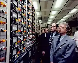 En effet, le , un accident nucléaire se produisit à la centrale nucléaire de Three Mile Island en Pennsylvanie[43]. La centrale avait des défauts de conception, et une série d'erreurs ont conduit à une surchauffe d'un des réacteurs. Le gouverneur de Pennyslvanie Dick Thornburgh, membre du Parti républicain, dut faire évacuer les femmes enceintes et les enfants pendant une dizaine de jours, tandis que le président Carter se rendit sur les lieux quatre jours après l'accident. Cinq jours seront nécessaires pour maîtriser la situation, tandis que le propriétaire de la centrale donna des informations erronées pour rassurer la population, mais en mentant également devant le gouverneur de l'État[43].