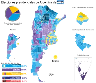 Donné second par les sondages, Sergio Massa arrive finalement en tête du premier tour avec près de 37 % des suffrages exprimés, suivi de Javier Milei (30 %) et Patricia Bullrich (24 %)[30]. Aucun candidat n'étant parvenu à réunir plus de 45 % des voix ou 40 % avec une avance de 10 % sur celui arrivé second, un second tour opposant Massa et Milei est organisé le [31].