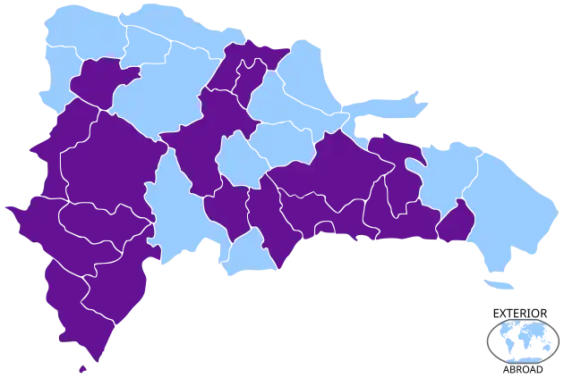 Depuis la Constitution de , sept sièges de députés sont attribués aux Dominicains vivant à l'étranger, estimés à plus de 1 400 000. Trois représentent l'Amérique du Nord (Canada et États-Unis, hors Floride et Porto Rico), deux pour l'Europe (Espagne, Italie, Suisse, Pays-Bas, France) et deux pour les Caraïbes et la Floride[4]. Le premier scrutin se déroule en même que l'élection présidentielle, le et présente 98 candidats.