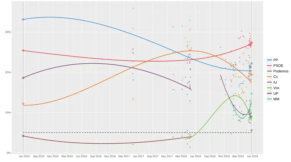 | PSOE[4] | 12/04/2018 | 26,3 % (36) |